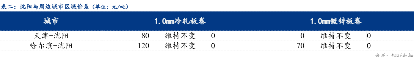 区域价差来看,天津-沈阳冷轧板卷区域价差保持不变,沈阳-哈尔滨冷轧板卷区域价差保持不变;天津-沈阳镀锌板卷区域价差缩小20元/吨,沈阳-哈尔滨镀锌板卷区域价差保持不变。种类价差来看,镀冷种类价差缩小50元/吨;镀热种类价差扩展60元/吨;冷热种类价差扩展10元/吨 。